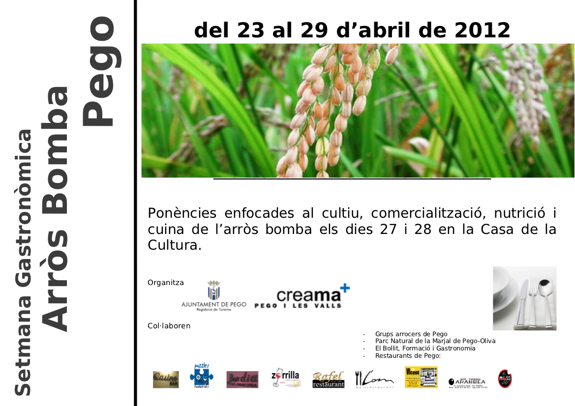 Del 27 al 29 d’abril de 2012, a la Casa de Cultura de Pego, es realitzaran ponències enfocades sobre el cultiu, comercialització, nutrició i cuina de l’arros bomba.