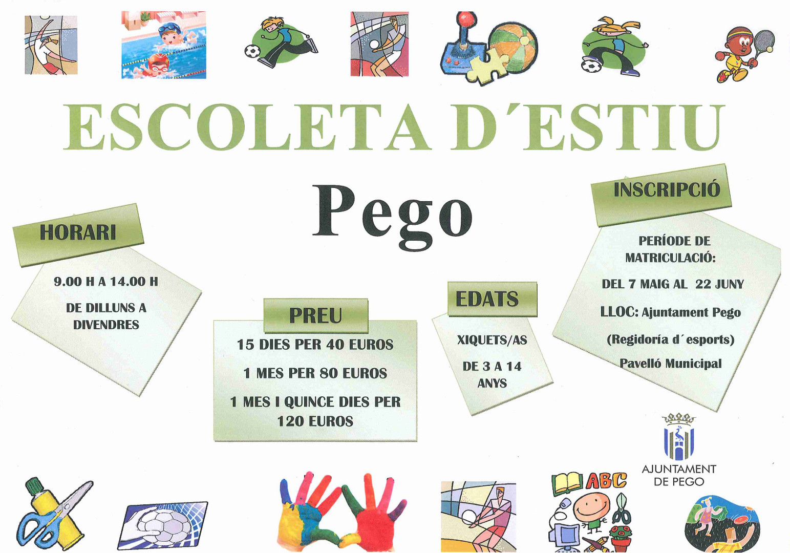 La REGIDORIA D’ESPORTS, amb la col.laboració en la REGIDORIA DE SERVEIS SOCIALS, ha creat un projecte D’ESCOLA D’ESTIU que va dirigit als xiquets del poble, és a dir des de els 3 anys fins als 14 anys. Mitjançant aquesta amplia franja, els alumnes podran gaudir dels jocs i activitats proposades.