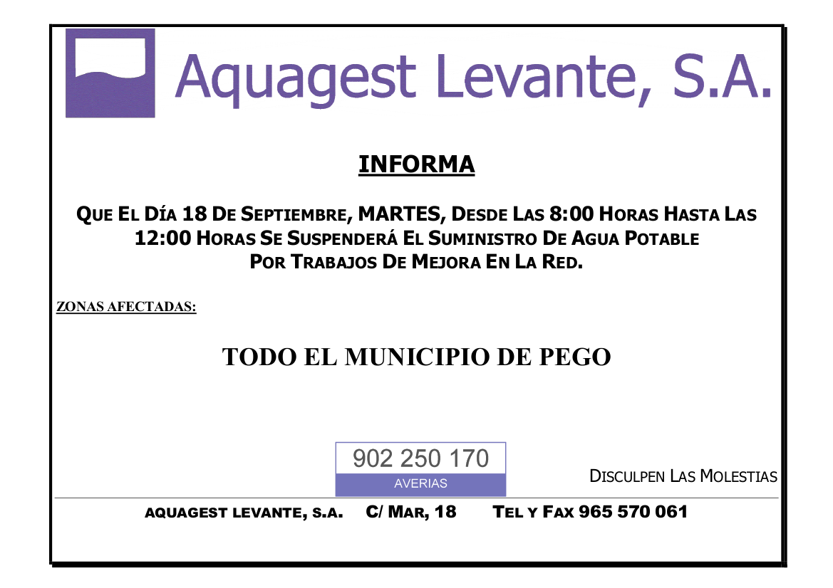 El día 18 de Setembre, dimarts, desde les 08:00 fins els 12:00 es suspendrà el suministre d’aigua potable en tot el municipi de Pego per treballs de millora en la xarxa.