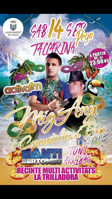 Com cada any la gent espera aquesta festa per celebrar el final de l’estiu, i que millor manera que gaudir de la nit pegolina, amb bona música, la millor d’aquest moments, amb els DJ’s Santi Bertomeu, Toni Arribas i Dj Pive, i com no ballar tota la nit disfressats, que és el que més ens agrada al nostre poble.