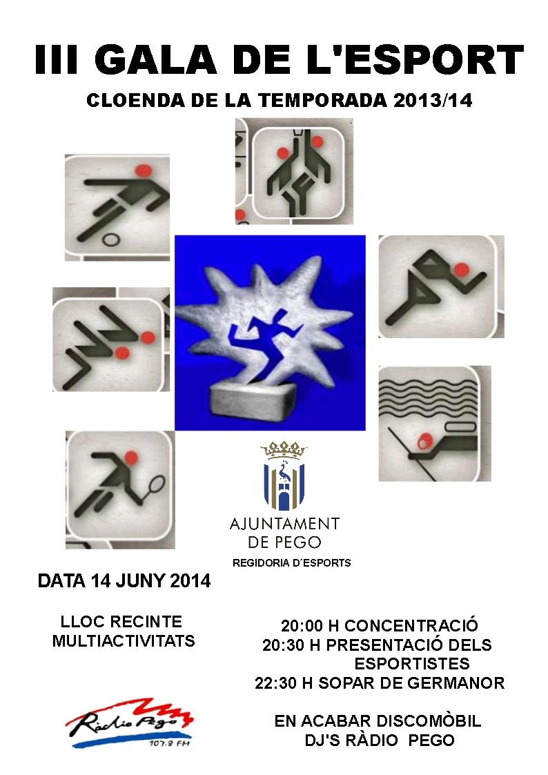 Esportistes de Pego, aquest proper dissabte 14 de juny a les 20:00h GALA DE L’ESPORT al nou recinte de multiactivitats “La Trilladora” A les 20:30 h començaran la presentació de la gala. Presentarem tots els equips dels diferents esports que es practiquen a Pego; futbol, bàsquet, natació, atletisme, pilota, carreters, voleibol, futbol sala, gimnàstica rítmica, esquaix, etc. després farem un sopar de germanor i tindrem música per a gaudir tots junts de la Nit de l’Esport a Pego.