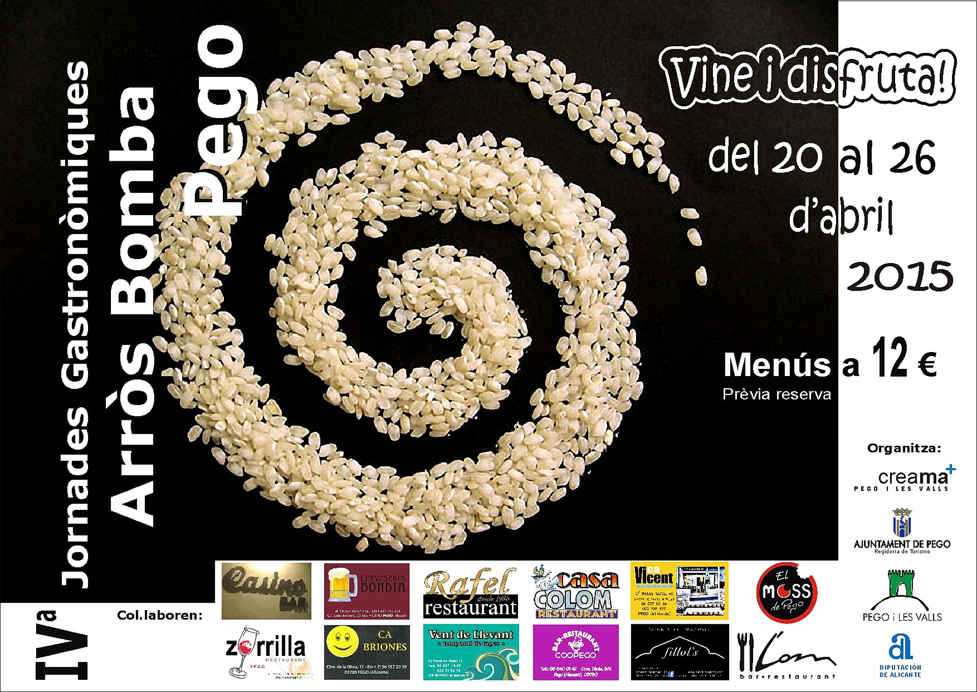 12 restaurants del municipi oferiran durant aqueixa setmana menús especials, a 12 euros, que inclouen, a més del plat principal amb l’arròs bomba com a base fonamental, entrades, una beguda, cafè o postres. És necessària reserva prèvia. Aquestes jornades volen donar a conèixer la importància i la versatilitat que té l’arròs bomba de Pego i, per descomptat, la qualitat de la cuina pegolina.