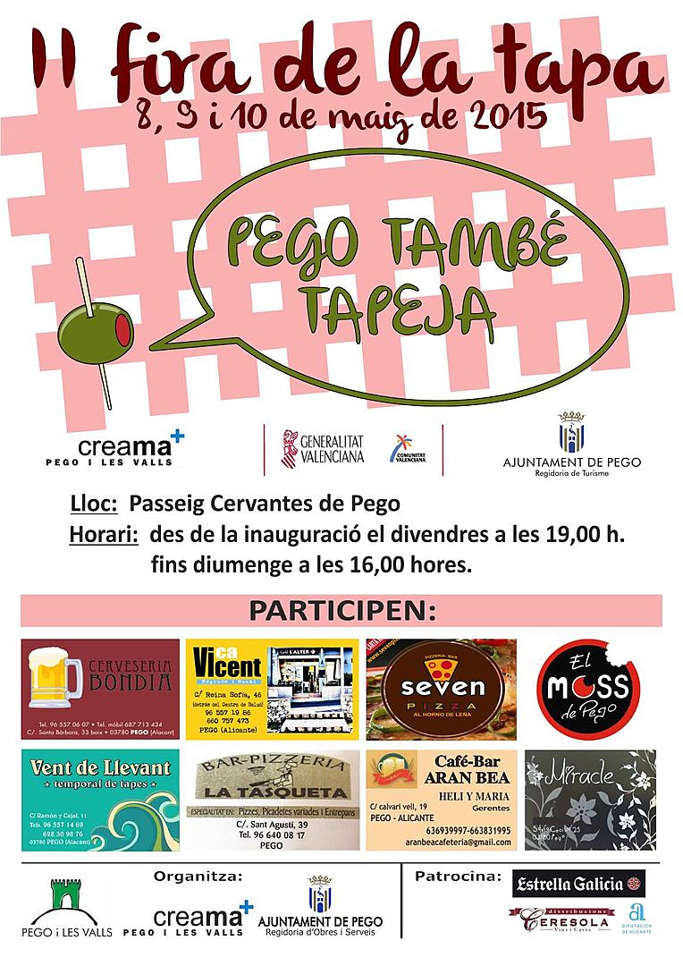 Les regidories de turisme i CREAMA de l’ajuntament de Pego han organitzat, gràcies a l’èxit de l’any passat, la 2ª fira de la tapa “Pego també tapeja”, que tindrà lloc els dies 8, 9 i 10 de maig.