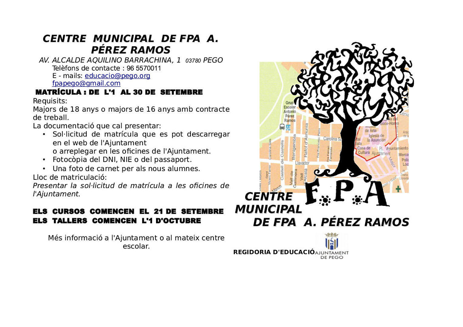 En la secció d’educació dedicada al CMFPA A. Pérez Ramos es pot consultar l’oferta educativa per al curs 2015/2016. Així com descarregar-se la sol·licitud de matricula per al proper curs.