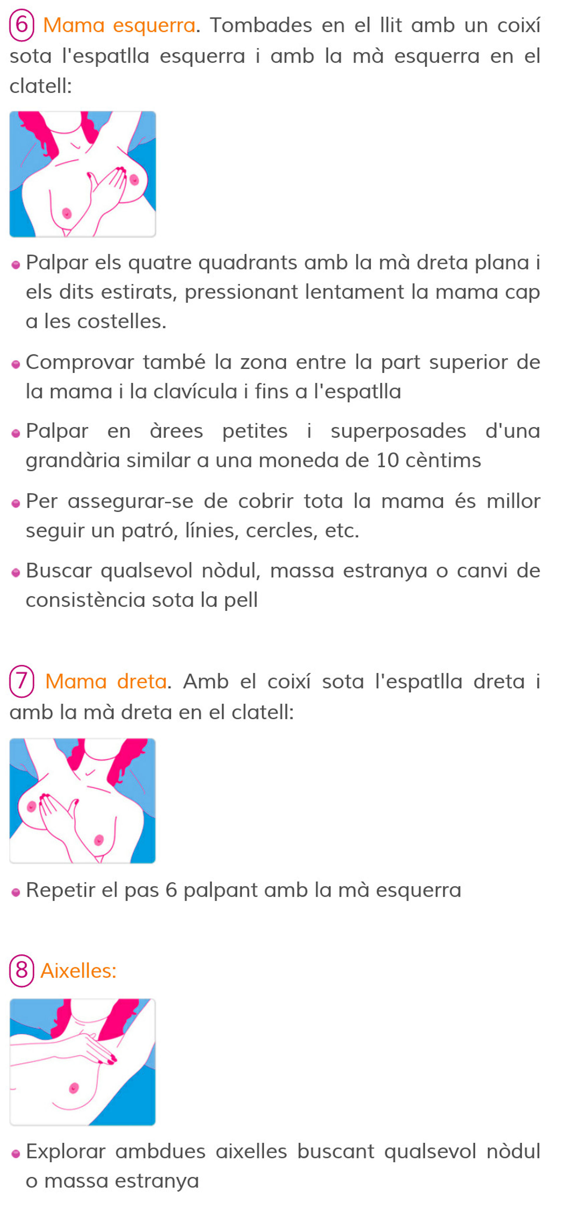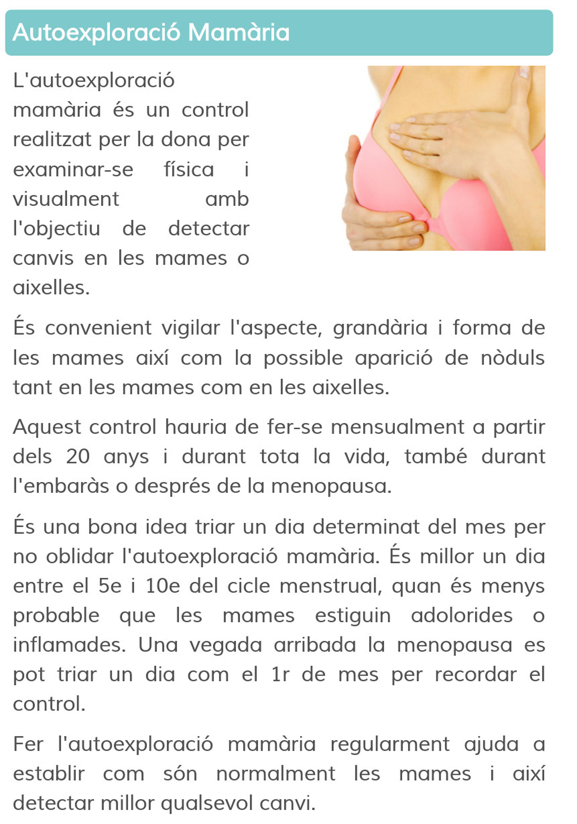 Avui, dia mundial contra el càncer de mama, des de la regidoria de Sanitat us recordem que el millor pronòstic del seu tractament és el diagnòstic precoç, pel que és molt important l’autoexploració mamària. Aquesta tècnica no ha d’utilitzar-se per reemplaçar, sinó per complementar, l’examen professional d’un metge i la mamografia.