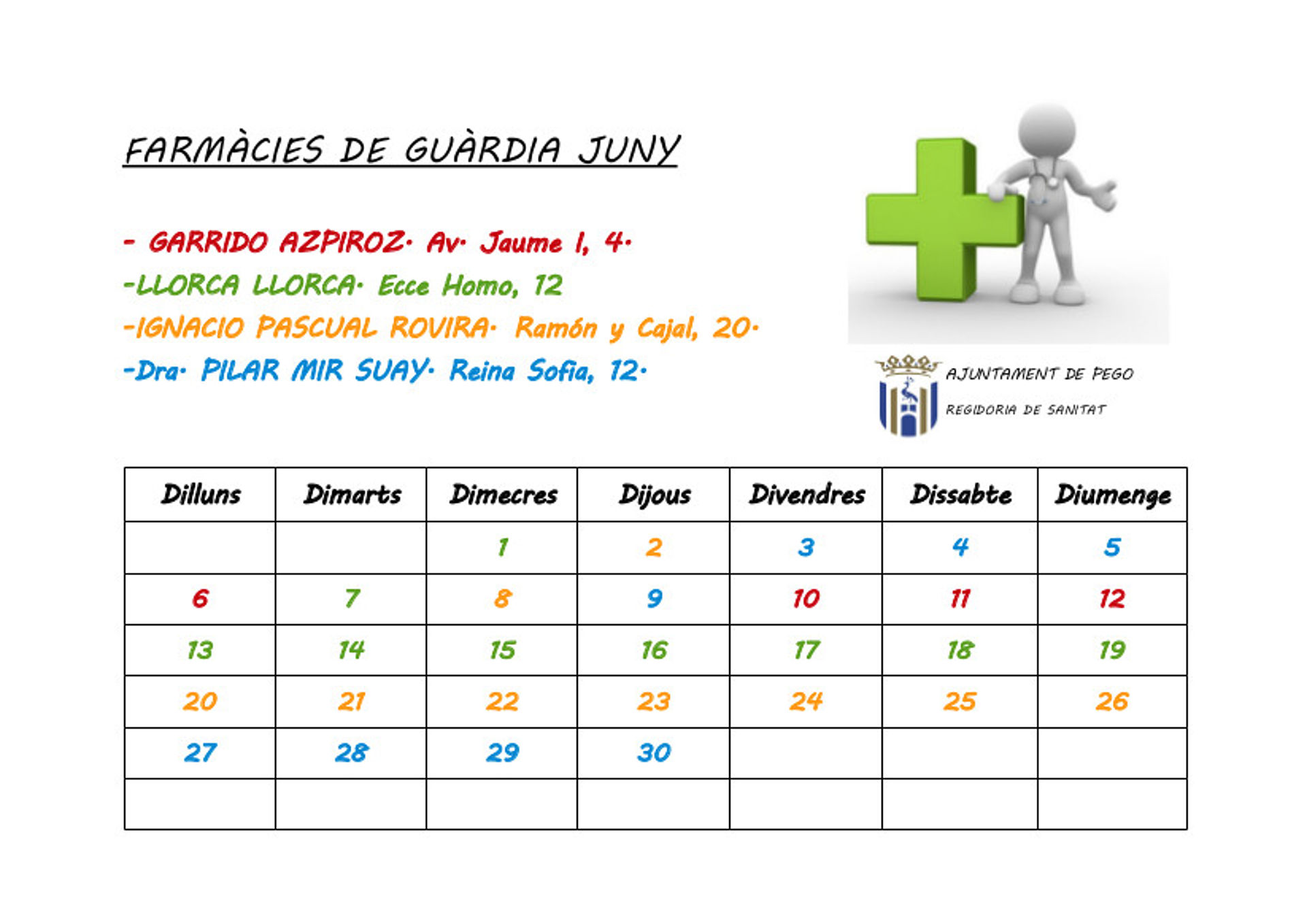 Des de la Regidoria de Sanitat us donem a conèixer quines seran les farmàcies de guàrdia per al mes de juny.