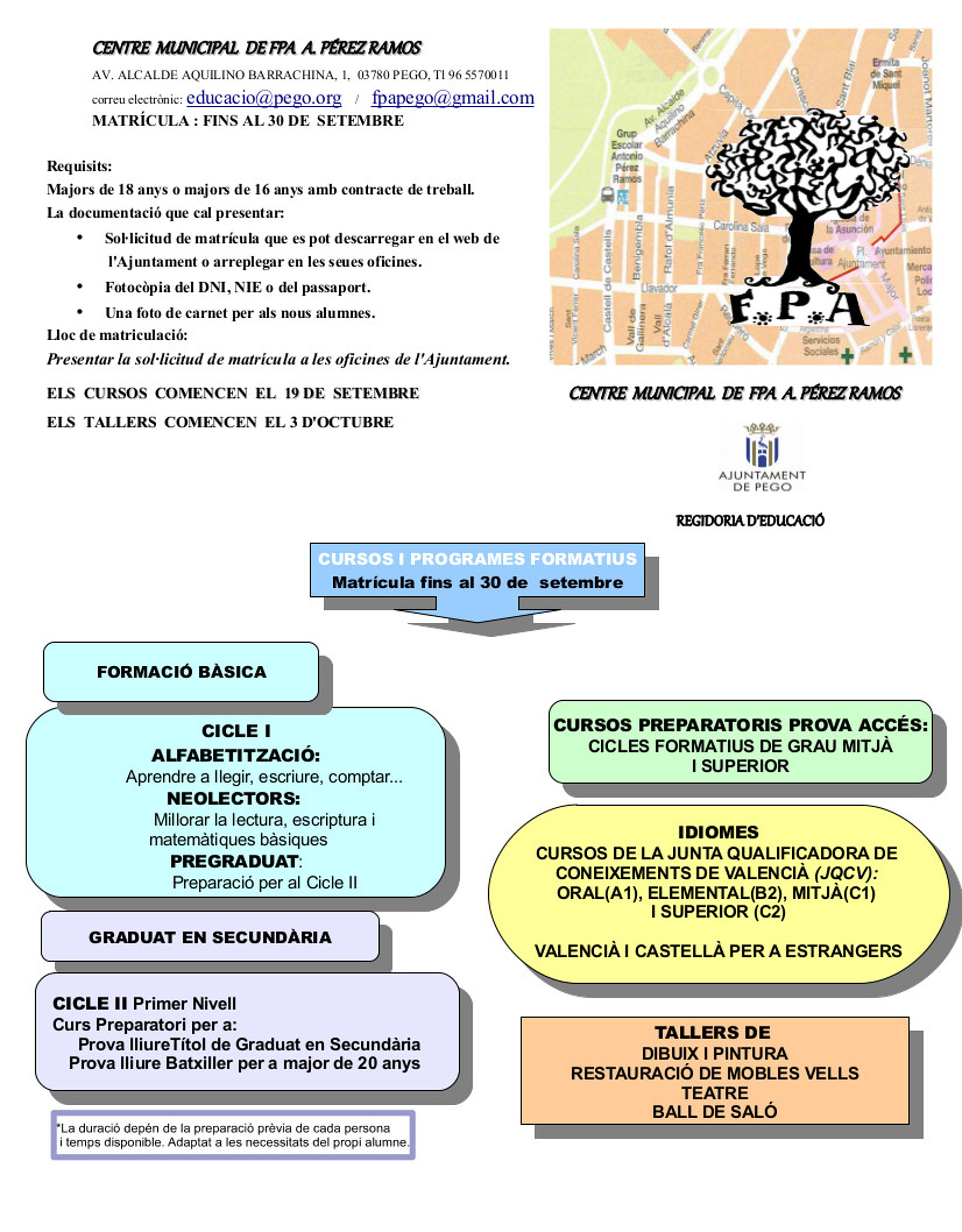 L’Ajuntament de Pego informa que s’obri el termini per a matricular-se als cursos i tallers que es fan en l’escola d’adults “CMFPA A.Pérez Ramos”.
