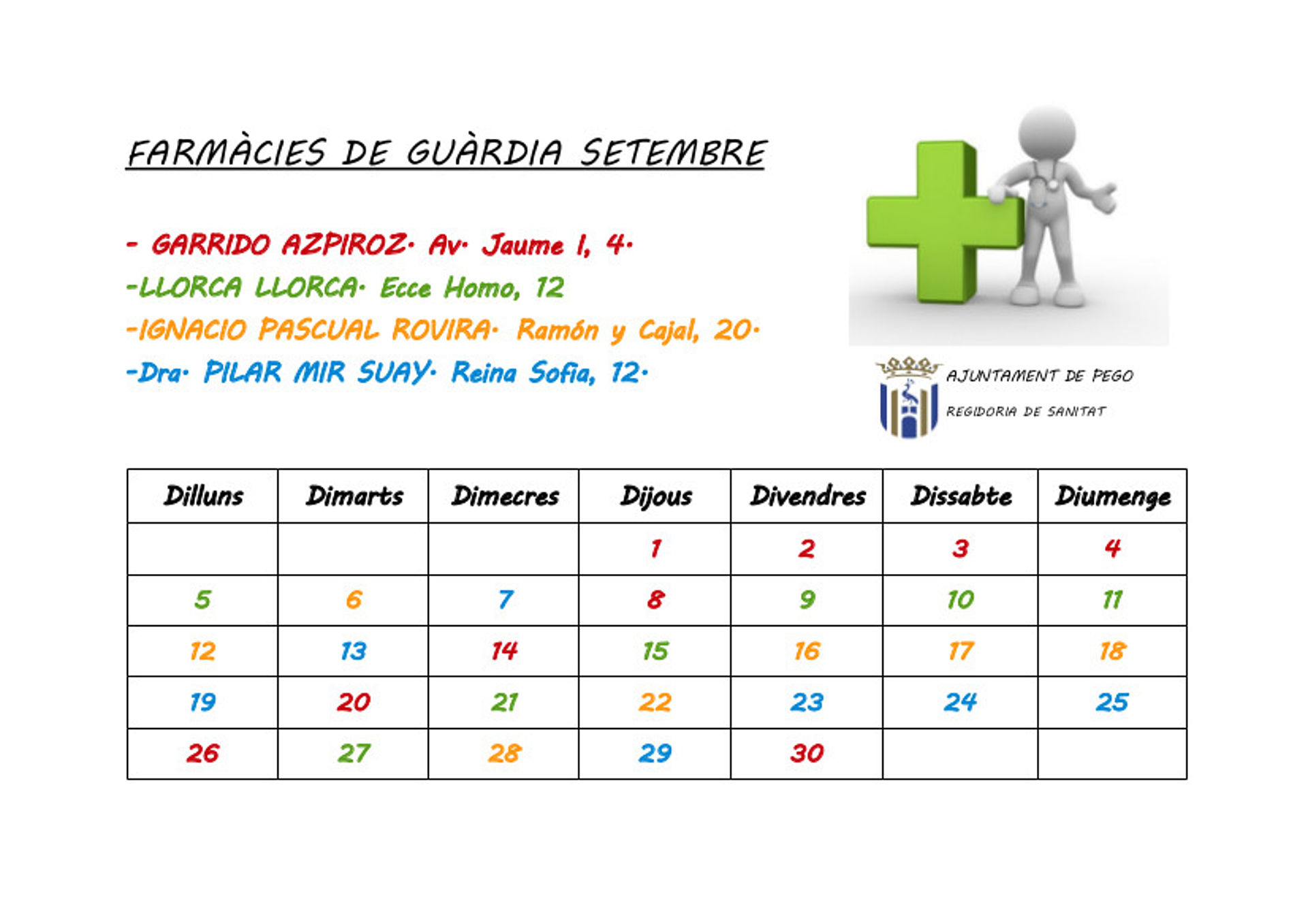 Des de la Regidoria de Sanitat us donem a conèixer quines seran les farmàcies de guàrdia per al mes de setembre.