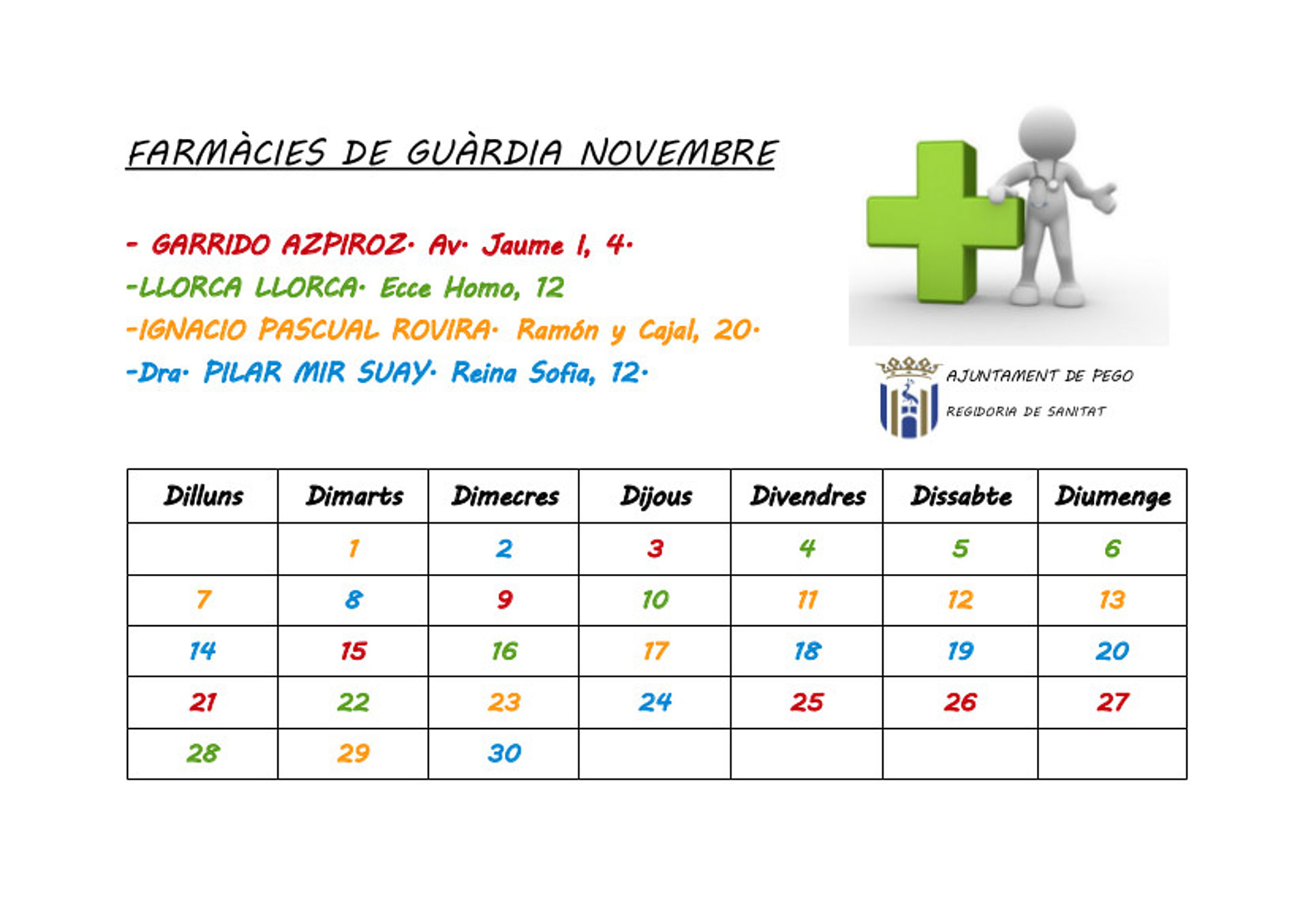 Des de la Regidoria de Sanitat us donem a conèixer quines seran les farmàcies de guàrdia per al mes de novembre.