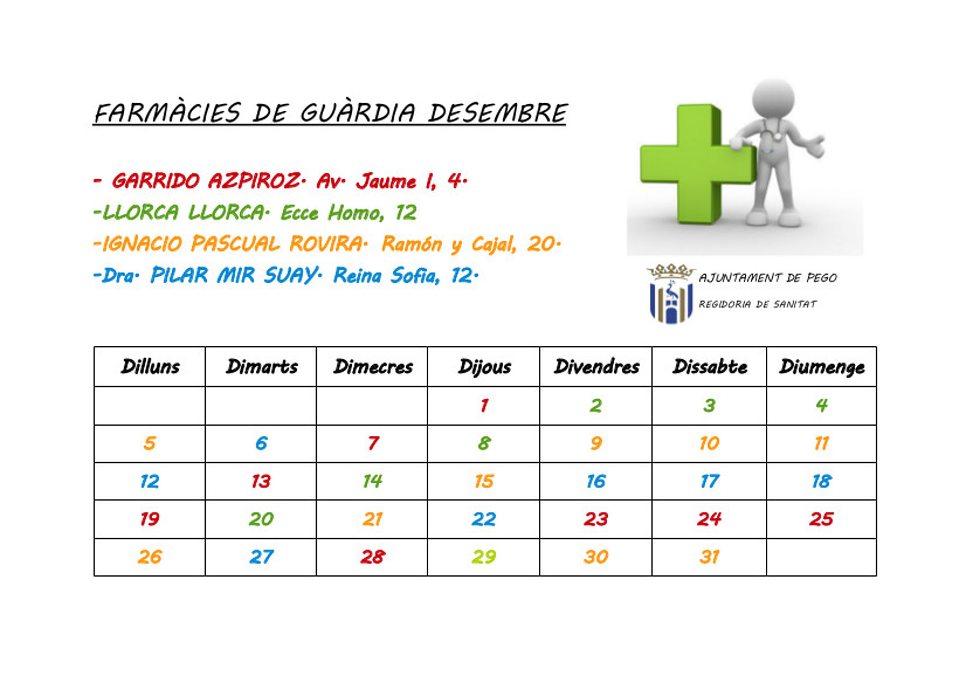 Des de la Regidoria de Sanitat us donem a conèixer quines seran les farmàcies de guàrdia per al mes de desembre.