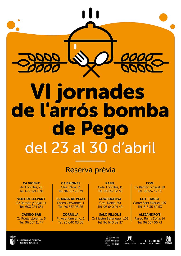 La regidoria de Comerç i Creama de l’Ajuntament de Pego junt en l’Associació d’Hostaleria de Pego han organitzat les VI Jornades de l’arròs Bomba del 23 al 30 d’abril. Participen 12 bars de la localitat es podrà tastar una gran varietat de receptes que tenen l’arròs bomba de Pego com a ingredient principal. La nova data per a la celebració d’estes jornades s’ha triat per coincidir amb la sembra de l’arròs bomba cultivat al Parc Natural de la Marjal de Pego-Oliva. Una data que vol mantenir-se per fidelitzar. Durant les jornades de l’arròs bomba de Pego s’oferiran menús amb un parell d’entrades, el plat principal elaborat amb arròs bomba de Pego, postre i una beguda inclosa. Enguany els preus dels menús variaran entre 12 i 18 euros depenent dels productes amb què es prepare cada plat. Serà necessària reserva prèvia. Durant eixa setmana la Tourist Info i els educadors del parc natural de la Marjal organitzaran rutes per conèixer l’espai de producció de l’arròs bomba.