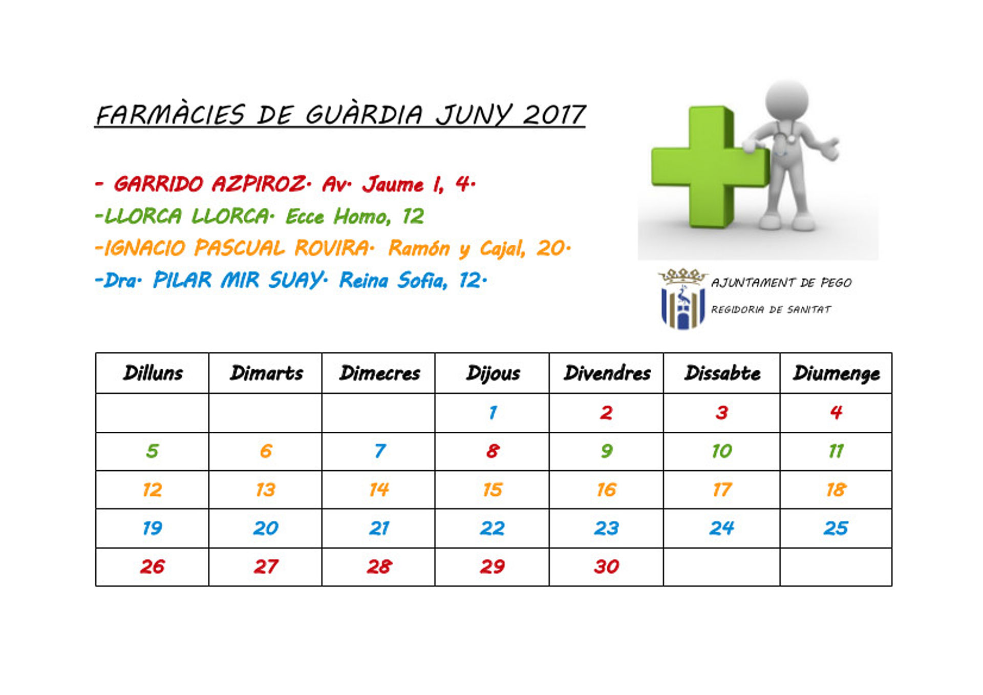 Aquestes seràn farmàcies de guàrdia per al mes de Juny. Atenció, fixeu-vos que a partir del 12 de juny comencen les guàrdies setmanals. Regidoria de Sanitat.