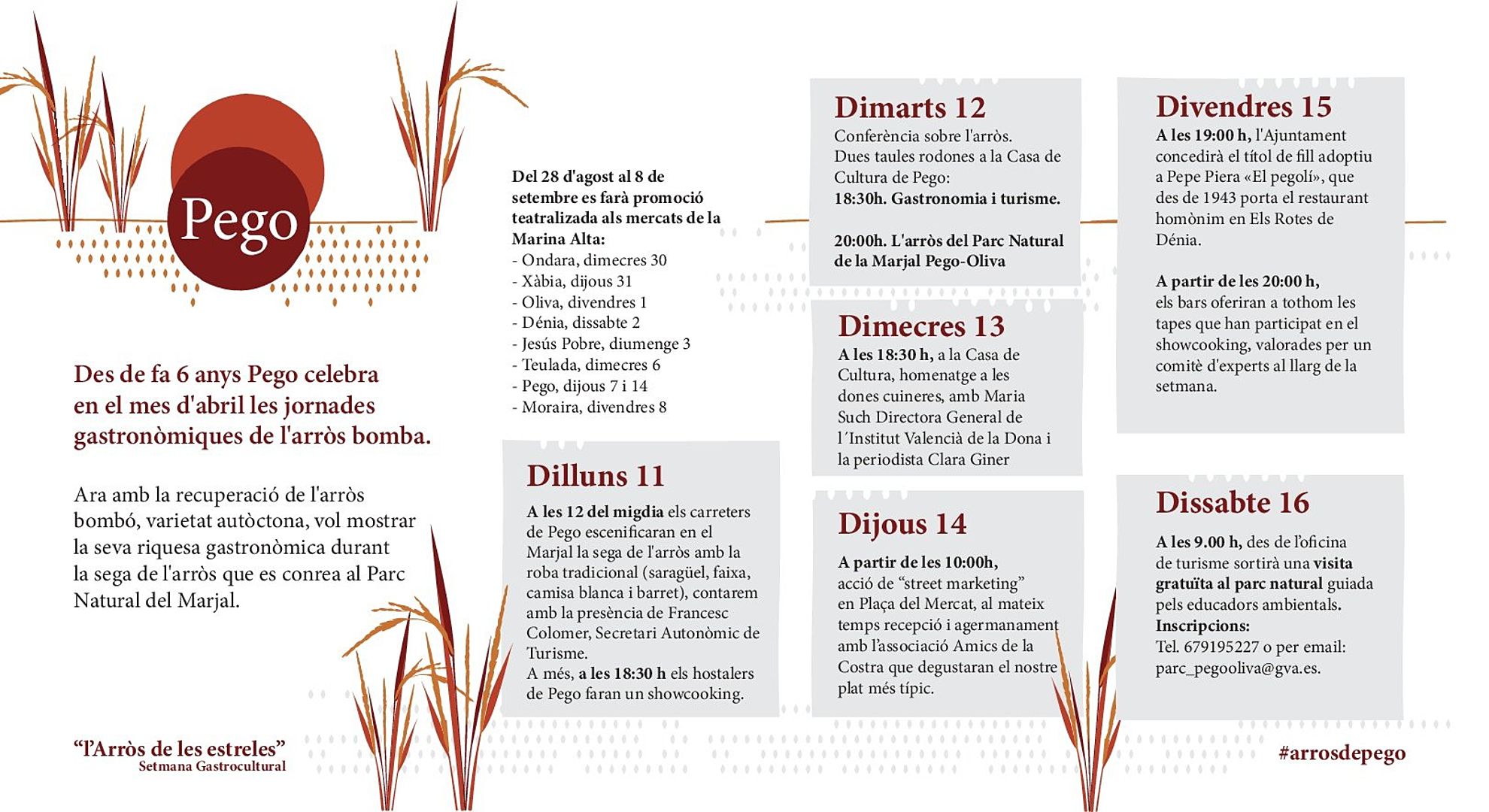 Aquest any amb motiu de la sega de l’arròs bomba iniciem les jornades de promoció d’aquest producte que es cultiva a la marjal Pego-Oliva des del segle XIV. La setmana de l’arrós comptarà amb diverses activitats que aniran al voltant de la natura, la cultura i, sobre tot, la gastronomia. A més a més des del dia 30 d’agost estarem en els diferents mercats de la Marina Alta promocionant la riquesa que tenim al nostre municipi.