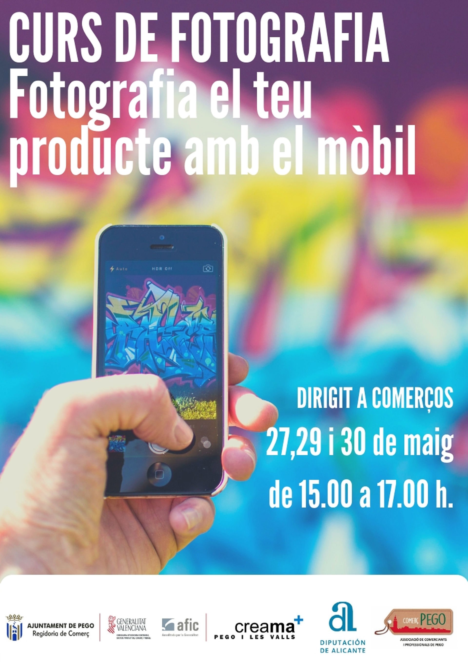Aquest curs està organitzat per Creama Pego amb la col·laboració de l’Associació de Comerciants i finançat per l’Ajuntament de Pego i la Diputació Provincial d’Alacant. Està orientat als autònoms i professionals del xicotet comerç. L’objectiu es que al finalitzar el curs els assistents compten amb unes ferramentes bàsiques i concises per a poder pujar a les seues xarxes socials, com Facebook i Instagram, unes fotografies de qualitat del seu producte.