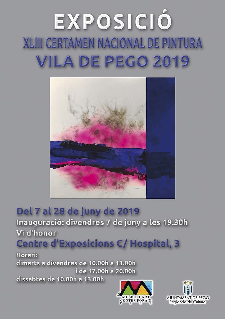 Les obres premiades i seleccionades en el XLIII Certamen Nacional de Pintura Vila de Pego estaran exposades del 7 al 28 de Juny de 2019 en el Centre d’Exposicions situat en el C/ Hospital numero 3. L’horari d’obertura del centre serà: