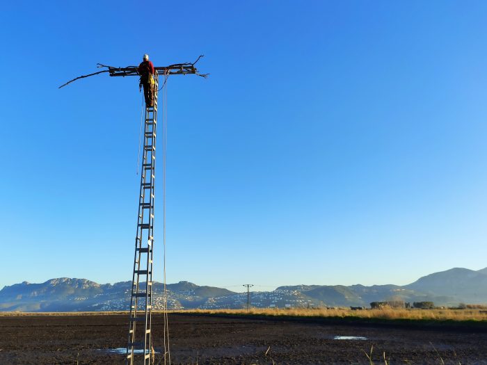 Per a la construcció d’aquests punts de descans i nidació, els membres de la Fundació Migres, encarregats d’aquest projecte, s’estan utilitzant torres elèctriques en desús, “són perfectes per a aquest tipus de funcions perquè estan a una altura òptima, en entorns allunyats de les persones i es poden adaptar amb relativa facilitat”, explica Itziar Colodro, membre de la fundació. El material que s’utilitza, recalca, és vegetació que es troba al parc, “cal aconseguir grans pals per a fabricar una base estable i suficientment gran per a les aus, són treballs costosos”.
