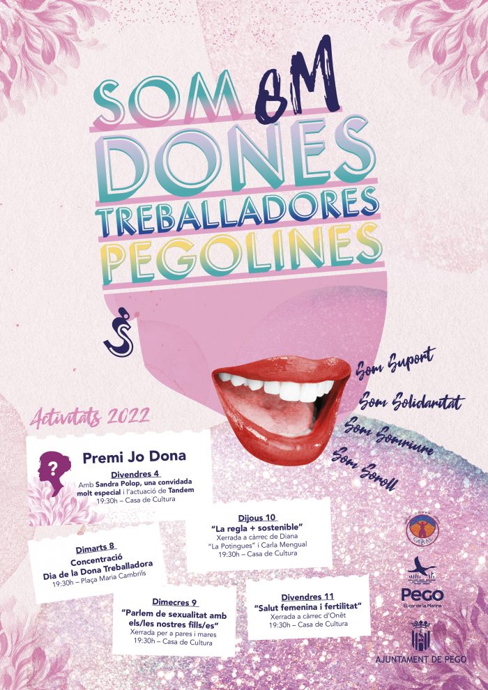 El primer dels actes programats serà el del dimarts 8 de març (Dia de la Dona). Tindrà lloc una concentració a les 19.30 hores a la Plaça Maria Cambrils. L’endemà, dimecres 9 de març, es celebrarà la ponència ‘Parlem de sexualitat amb els nostres fills i filles’, dirigida a pares i mares; a la Casa de Cultura de Pego, a les 19.30 hores. El dijous 10 de març, a les 19.30 hores a la Casa de Cultura, tindrà lloc una altra ponència, ‘La regla + sostenible’, a càrrec de Diana Sendra, gerent del comerç ‘La Potingues’ i la fisioterapeuta, Carla Mengual. Per últim, el divendres 11 a les 19.30 hores, també a la Casa de Cultura, es celebrarà una última ponència ‘Salut femenina i fertilitat’, a càrrec d’Antonia González, directora i fundadora d’Onet, clínica espezialitzada en fertilitat.
