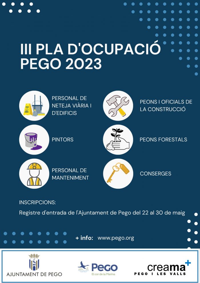 L’Ajuntament de Pego, a través del departament de Creama, ha posat en marxa el III Pla d’Ocupació. En aquesta ocasió s’oferiran llocs de treball destinats a persona de neteja viària i d’edificis, peons i oficials de la construcció, pintors, peons forestals, personal de manteniment i conserges.