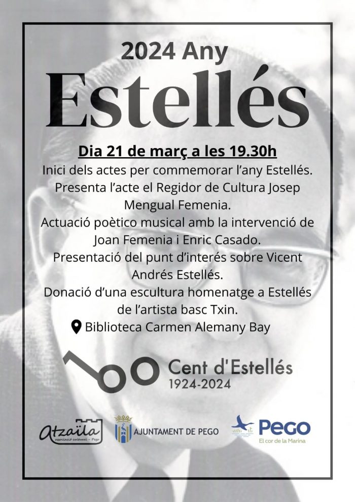 Pego retrà homenatge a Vicent Andrés Estellés, un dels poetes valencians més importants i del qual se celebra este 2024 el centenari del seu naixement. Per a celebrar destacada efemèride el consistori ha decidit programar una sèrie d’actes dedicats a la figura de l’autor, que va nàixer a Burjassot un 4 de setembre de 1924.
