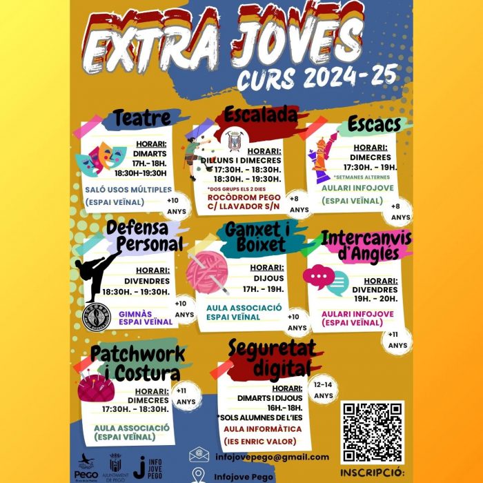 Activitats per a tots els gustos. L’Ajuntament de Pego, a través del departament d’Infojove torna a oferir aquest any, i ja van quatre seguits, el programa ‘Extra Joves’, una sèrie d’activitats pels més i les més joves del municipi. Es tracta de tallers de diferents temàtiques en els quals han participat, en darreres edicions, més d’un centenar de joves.