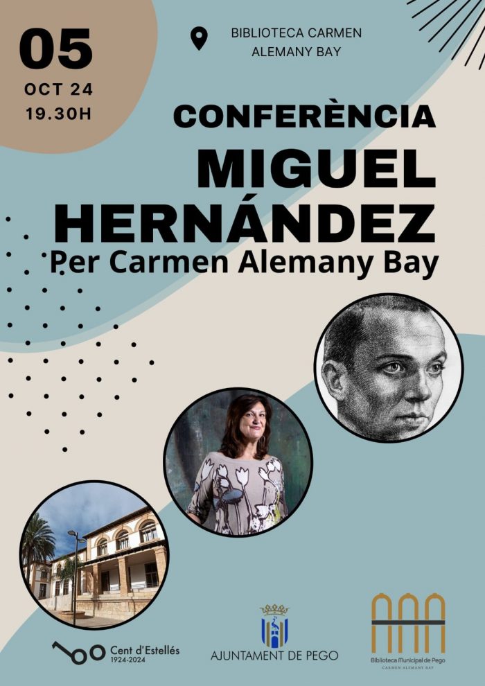 El dissabte 5 d’octubre, a les 19,30 hores, està prevista una conferència sobre Miguel Hernández, de l’acadèmica pegolina Carmen Alemany Bay, qui dona nom a la biblioteca. Doctora en Filologia hispànica. Catedràtica de literatura hispanoamericana de la Universitat d’Alacant, Alemany ha dedicat part del seu treball al poeta alacantí, ha sigut antòloga i editora d’obres d’este universal autor, especialment, l’edició de l’Obra completa de Miguel Hernández.