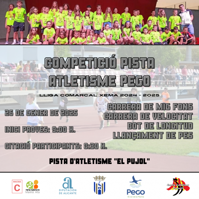 Aquest diumenge, 26 de gener de 2025, Pego es convertirà en l’epicentre de l’atletisme escolar amb la celebració de la competició de pista corresponent a la Lliga Comarcal XEMA 2024-2025. L’esdeveniment tindrà lloc a la pista d’atletisme “El Pujol” i comptarà amb la participació de joves atletes de tota la comarca, que es disputaran les proves des de les 9 hores del matí.