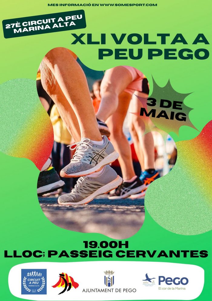 Una altra de les proves més esperades pels corredors és la de la prova degana del Circuit a Peu de la Marina Alta, la Volta a Peu a Pego, que enguany celebra la seua 41 edició. Se celebrarà el pròxim 3 de maig. Una vesprada que arrancarà amb les proves per als xiquets i xiquetes al voltant de les 16 hores, mentres que la prova principal arrancarà a les 19 hores. Respecte al recorregut, explica Ferrandis, serà bàsicament el mateix de l’any passat, amb un circuit urbà d’uns 4 quilòmetres i la resta es desenrotllarà pel terme municipal. L’eixida i arribada serà en el Passeig Cervantes.
