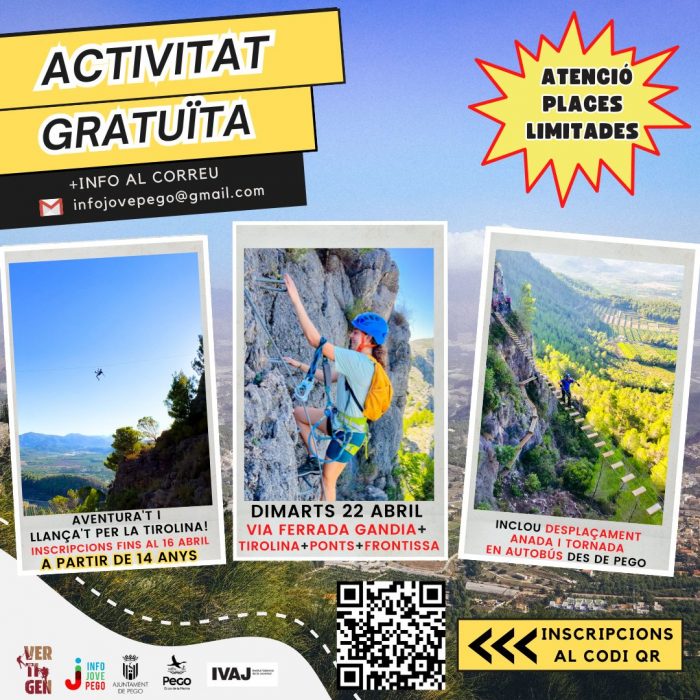 Per al dimarts 22 d’abril s’ha programat una jornada de multiaventura: passeig per la Via Ferrada de Gandia, tirolina y ‘frontisa’ (escalada vertical). Una activitat que podran gaudir els i les jóvens de més de 14 anys, mitjançant inscripció prèvia.