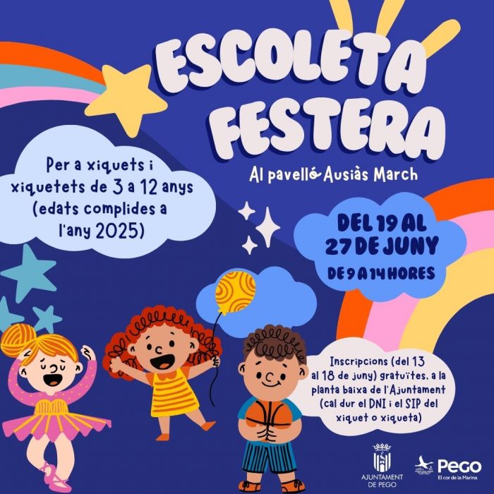 Amb la intenció d’aconseguir millorar la conciliació familiar, aquest estiu es posa en marxa, també, l’Escoleta Festera (que estarà operativa des del 19 de juny fins al 27 de juny. Exceptuant el dia 24 per ser dia festiu), una iniciativa pensada per a oferir als xiquets i xiquetes del municipi un espai on gaudir de les vacances d’una manera activa, educativa i segura.