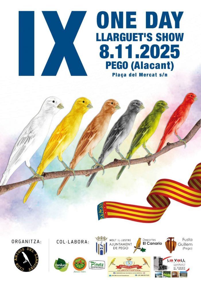 Els canaris torna a Pego per a presumir de bellesa. De nou la localitat pegolina celebrarà una nova edició del ‘One Day Llarguet Show’, que complix la seua novena edició. Es tracta del concurs que mesura l’atractiu del Llarguet, una raça de canari autòctona de la Comunitat Valenciana i que organitza el ‘Club Amics del Llarguet’ amb la col·laboració de l’Ajuntament de Pego. Es donaran cita, el dissabte 8 de novembre, 600 ocells d’esta espècie.