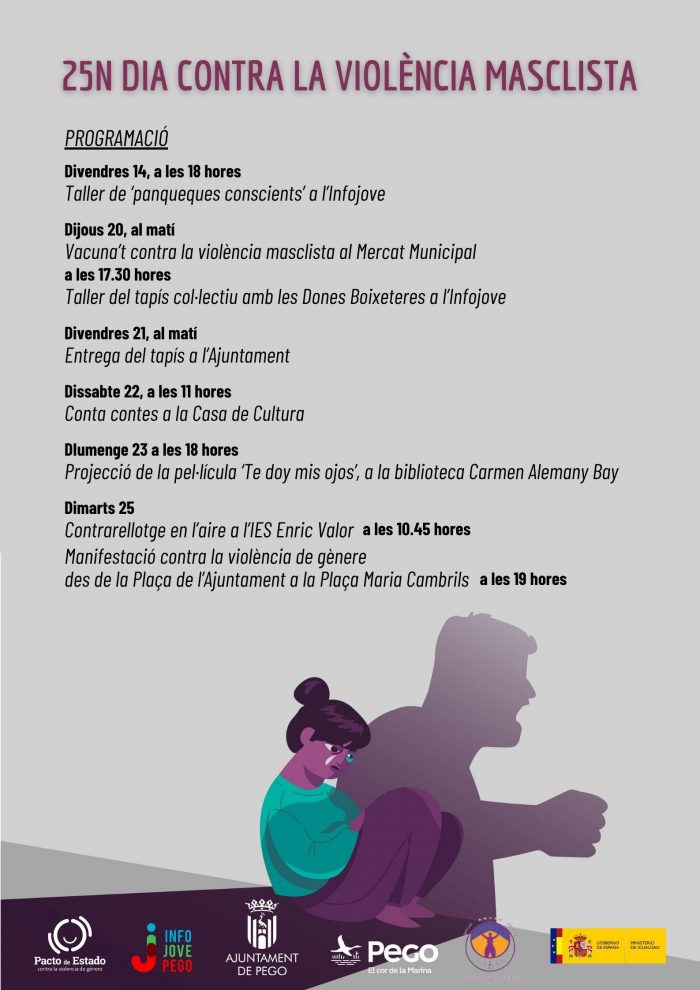 Pego es tiny de morat per novembre. L’Ajuntament de Pego es bolca amb la celebració del 25N i ha preparat una sèrie d’activitats per a este mes que giren entorn d’esta efemèride. Una programació que ha comptat amb la implicació d’Infojove, el departament de Joventut del consistori i també la participació d’associacions locals.