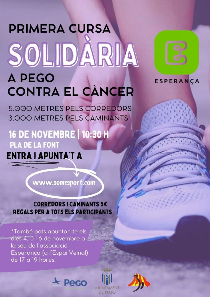 Pego té una cita solidària. El municipi celebra el pròxim 16 de novembre la primera carrera solidària contra el càncer. Una jornada, organitzada per l’Ajuntament de Pego i l’Associació Esperança i oberta a totes les edats, amb la finalitat de donar suport a la lluita contra el càncer i fomentar, també l’activitat física saludable.