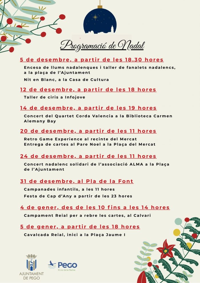 “Hem preparat una programació pensada per a agradar a tots els públics, des dels més xicotets fins a les persones majors, perquè Nadal a Pego és un moment per a gaudir en comunitat i reforçar els llaços que ens unixen”, indica la regidora de Festes. L’edil apunta, a més, que la programació nadalenca “és possible gràcies a l’esforç conjunt d’associacions, comerços, entitats locals i un gran nombre de voluntaris i voluntàries, als qui vull agrair profundament la seua implicació”. Remarca també “la gran faena del personal de l’Ajuntament, que es bolca cada any perquè estes dates es visquen amb il·lusió, proximitat i seguretat”.