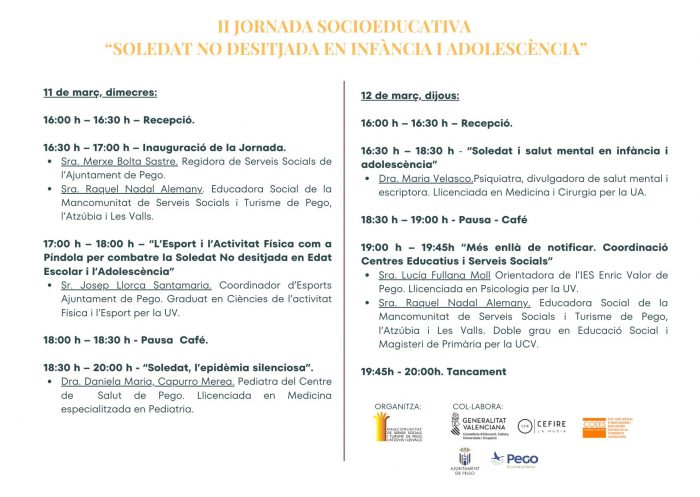 Durant els dos dies de sessions participaran professionals de l’àmbit sanitari, educatiu, esportiu i institucional, que abordaran la soledat no desitjada de manera transversal. Intervendran Daniela Maria Capurro, pediatra del centre de salut de Pego; Josep Llorca, coordinador d’Esports de l’Ajuntament de Pego; Raquel Nadal, educadora social de la Mancomunitat de Serveis Socials i Turisme de Pego i Les Valls; Lucía Fullana, orientadora de l’IES Enric Valor de Pego; Merxe Bolta, regidora de Serveis Socials; i Maria Velasco, psiquiatra divulgadora en salut mental i escriptora, considerada una de les veus més destacades sobre aquesta matèria.