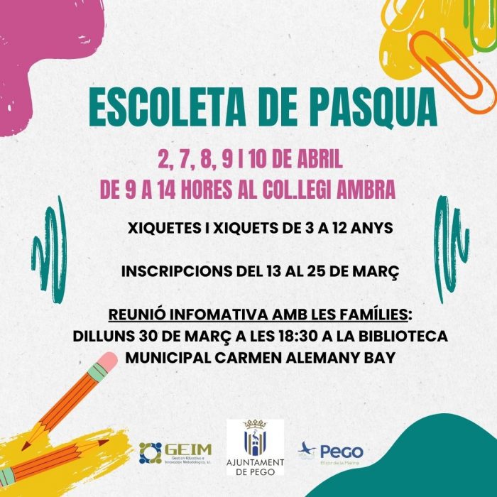 Les inscripcions podran realitzar-se des de hui, 13 de març, fins el dia 25 de març des de les 8 del matí a les 14 hores, de forma presencial, a l’Ajuntament de Pego o per la seu electrònica del web de l’Ajuntament de Pego.