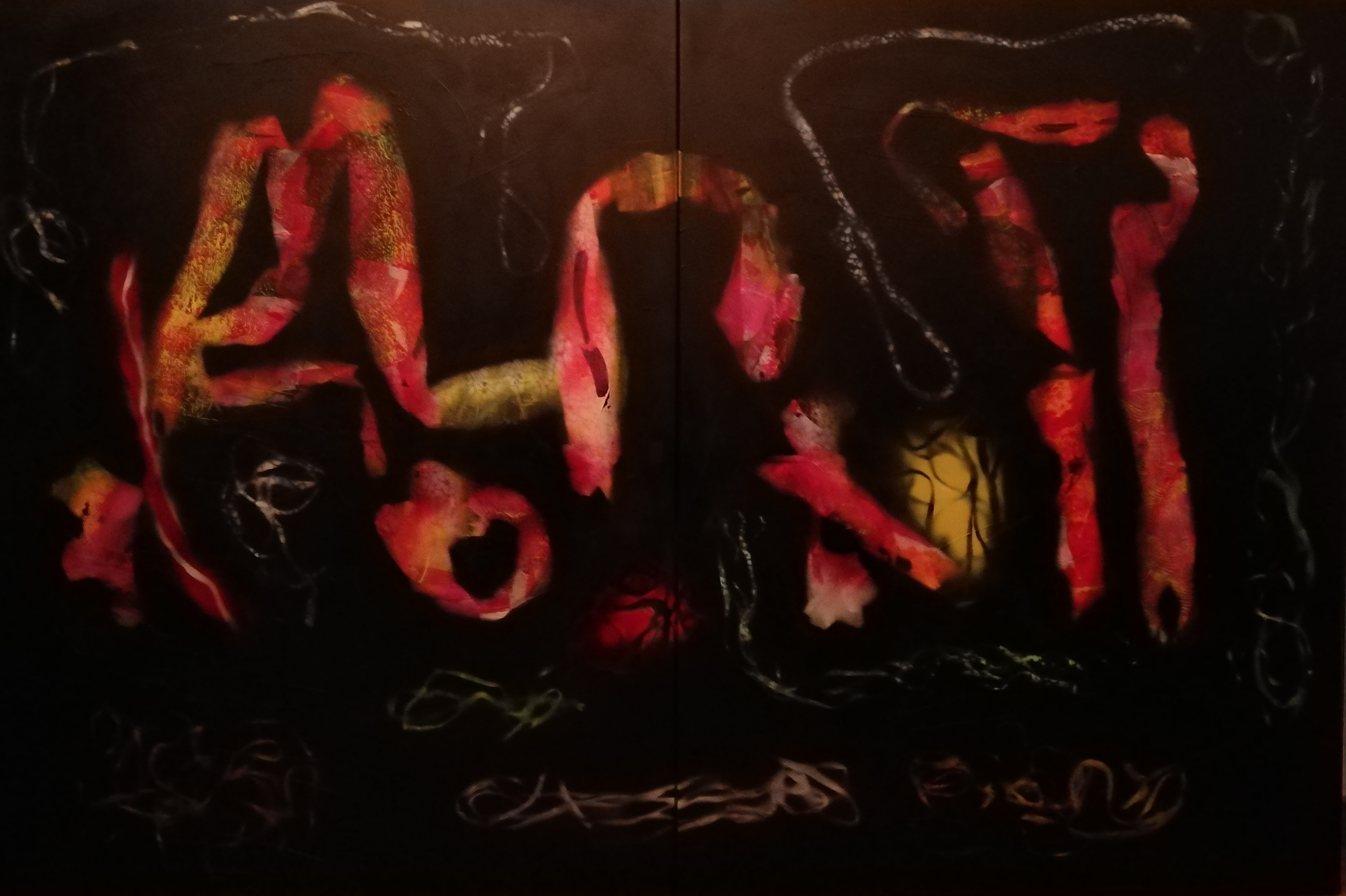 Mixta, acrílics, pintura plàstica, lletres transferibles sobre bastidor .
