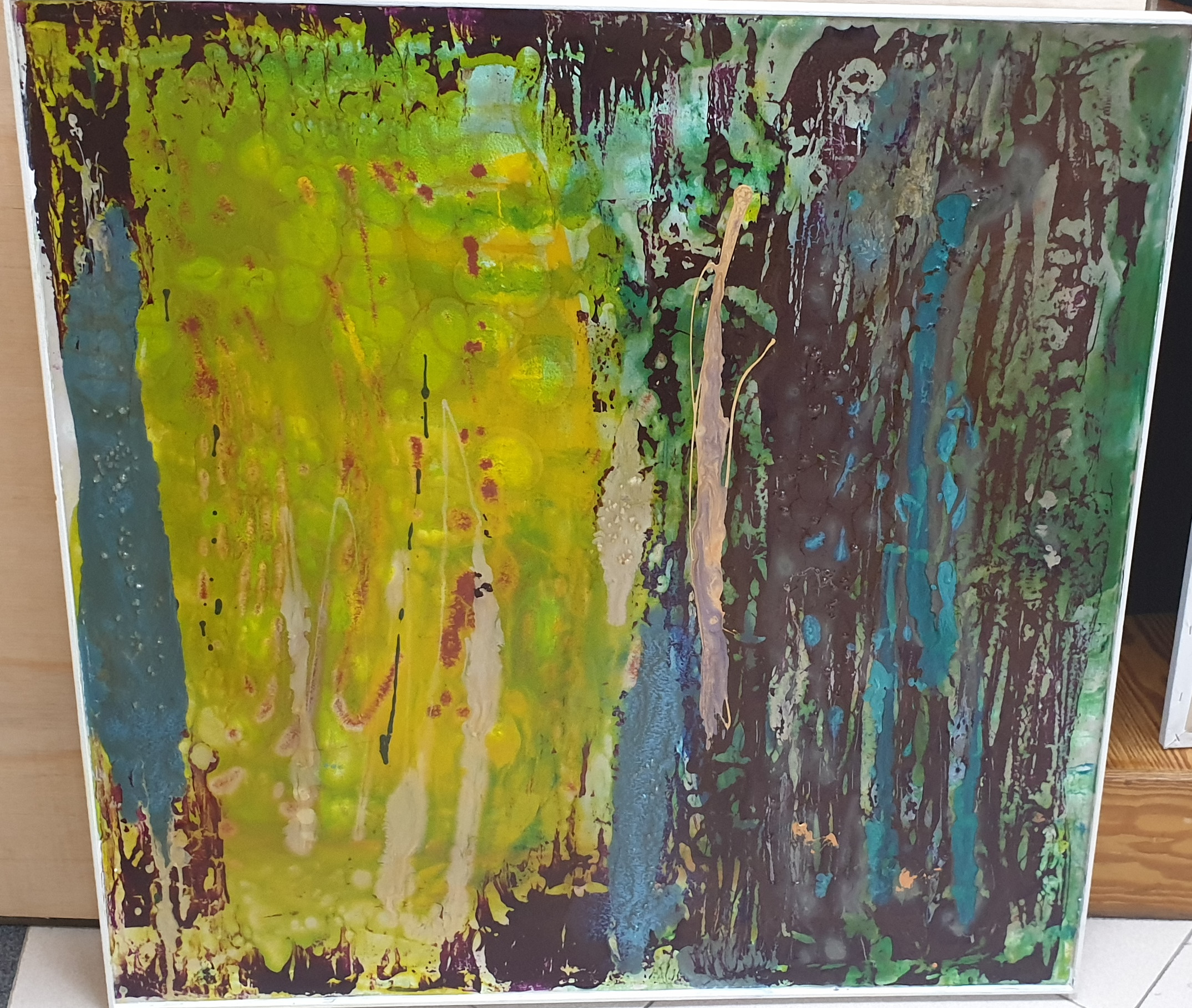 Mixta, amb incisions amb burí i acabat amb resina sobre taula.